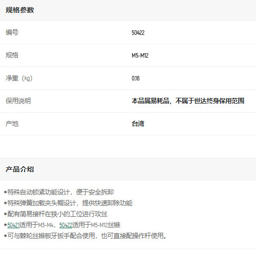 首頁>產(chǎn)品中心>其他手動(dòng)工具>其他手動(dòng)工具及配件>世達(dá)絲錐轉(zhuǎn)接頭M5-M12